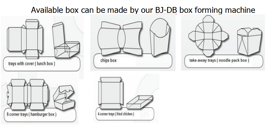 BJ-DB 全自动立体纸盒成型机可以生产一次性的汉堡纸盒, 外卖餐盒, 炸鸡盒,薯条盒,食品盒等由卡纸,普通原纸和瓦楞纸制成的纸盒。该机器具有结构稳定,质量保证,低噪音,高效率等特点